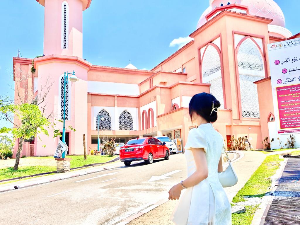 在观察沙巴大学内的粉红清真寺的少女