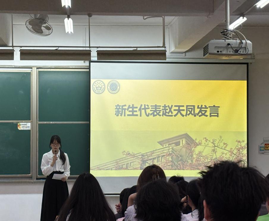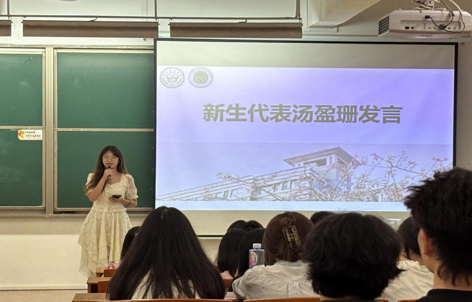 新生代表汤盈珊以“向上的勇气与向善的温度”为主题,呼吁同学们勇敢面对新环境的挑战,保持开放和宽容的心态,注重互助与协作,在学业与校园活动中双向成长。