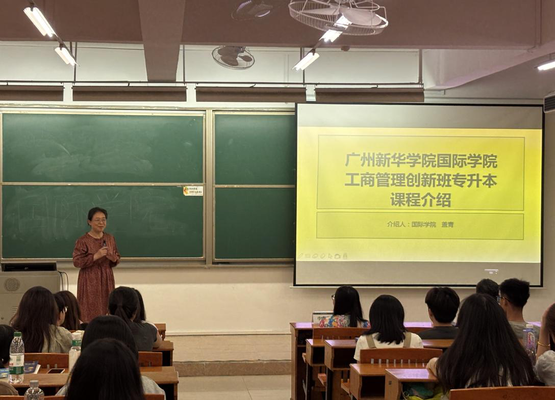 专业主任盖青老师详细介绍了学院的培养目标,涵盖个人素质提升、工商管理专业知识、中英双语沟通能力及思维训练等多个方面。她强调学院以双语教学为特色,并为新生梳理了大学生活规划,建议大家条理清晰、目标明确地度过大学时光。