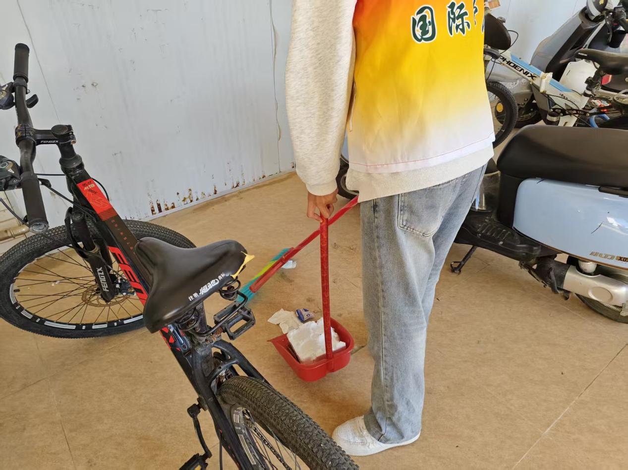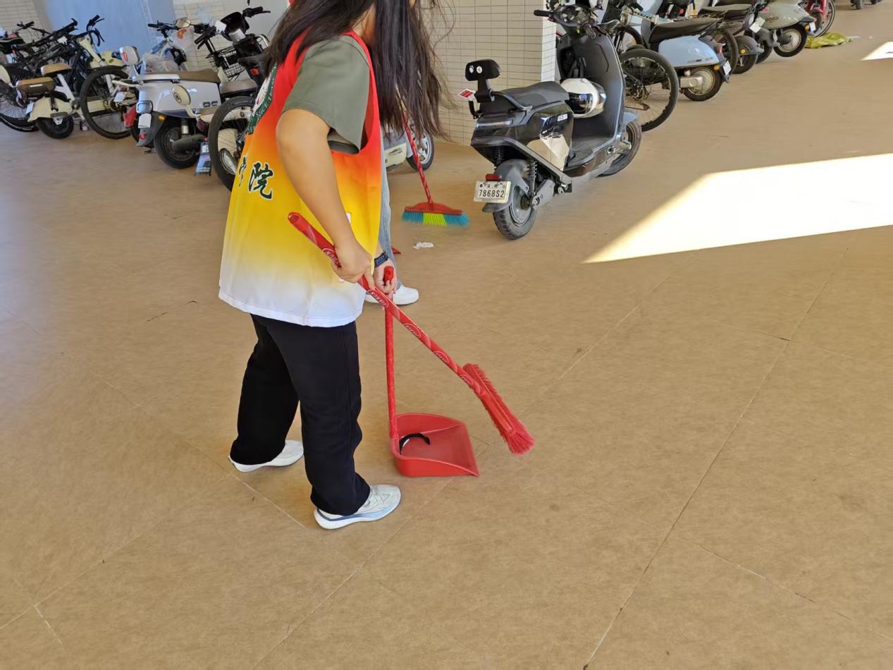 志愿者们组成清理小组,奔走在9栋宿舍楼前后、停车区域的缝隙边缘等隐蔽位置,对堆积的废弃杂物、残留的果皮纸屑以及藏匿的烟头等进行彻底清理。大家拿着夹子、垃圾铲等工具,仔细清理每一处容易被忽略的地方,让校园的各个角落都回归了干净整洁