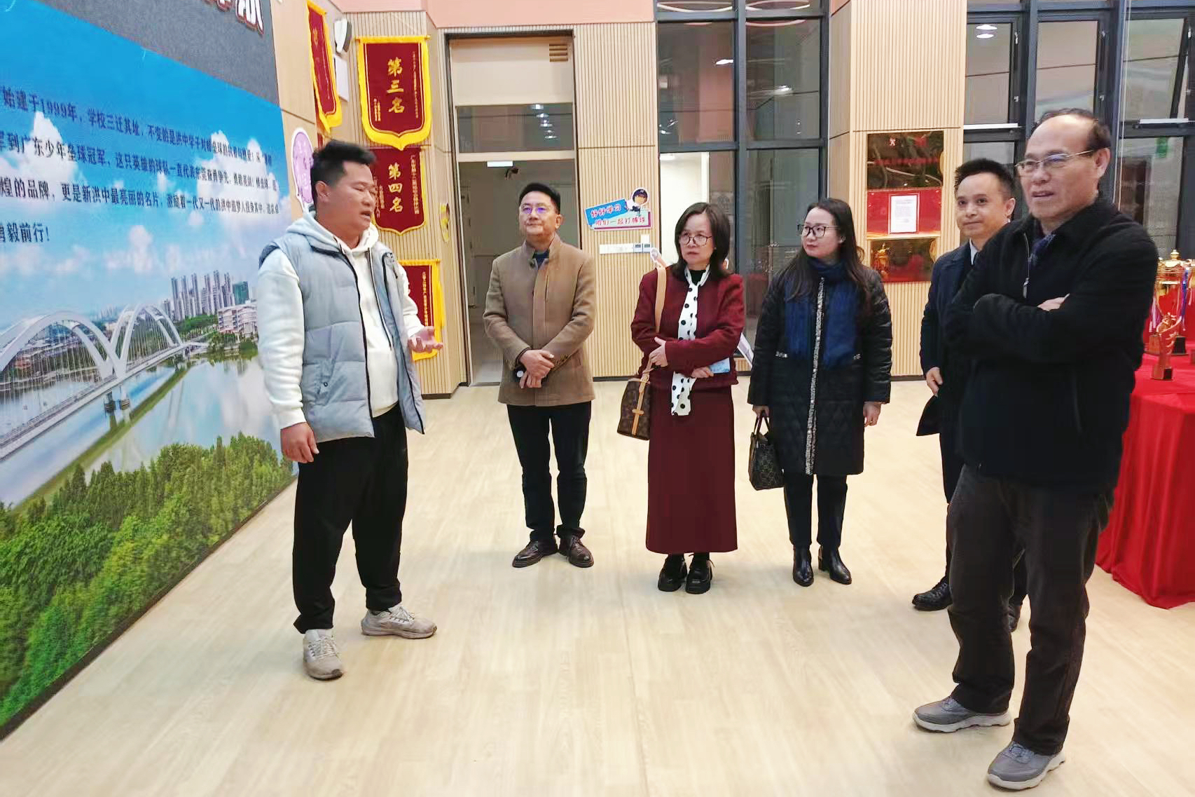 东莞中学洪梅学校教师为马龙海副校长一行介绍棒垒球展览馆