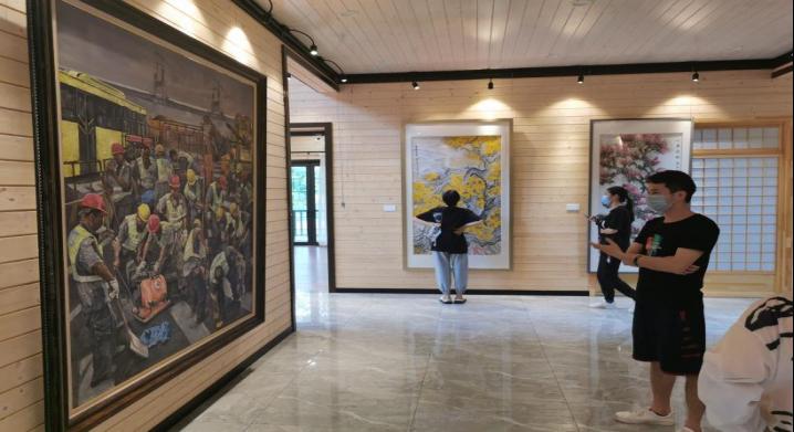 随后,学生们各自欣赏其他书画作品。在一幅巨大的油画面前,张期威同学陷入沉思,画中所展示的是工人在工地里施工的情景,画中人物的举动和神态展现的是基层劳动者的朴实与勤劳的品质,以及乐观向上的精神。画中人物坚毅的眼神与微微上扬的嘴角仿佛在告诉观画人他们对自己的工作充满自豪。张期威颇有感悟地表示:“劳动的人民是最美的,也是城市最亮丽的风景线。”