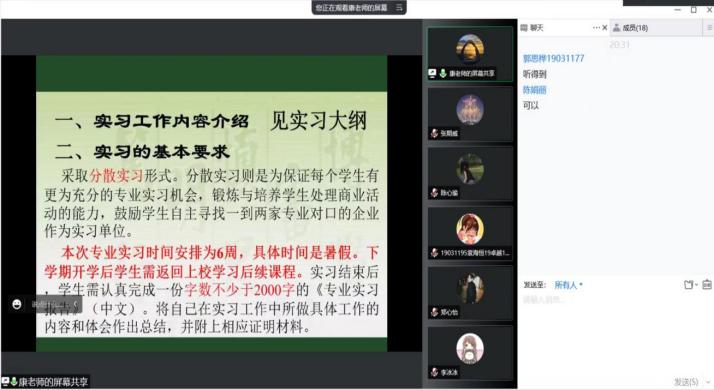康星华老师结合学校的相关规定与要求,结合suncitygroup太阳新城实习要求,向同学们详细讲解了实习工作内容,并提出任务和建议。一、本次实习采取分散式实习,实习效果将作为必修课程计入学生成绩档案;二、要完成实习任务,按照学院规定完成实习报告、周记、每天系统打卡等;三、实习过程中要善于思考和学习,掌握和总结工作的内容和流程,把专业知识充分地运用到实习工作中;四、强化安全意识和遵守纪律。