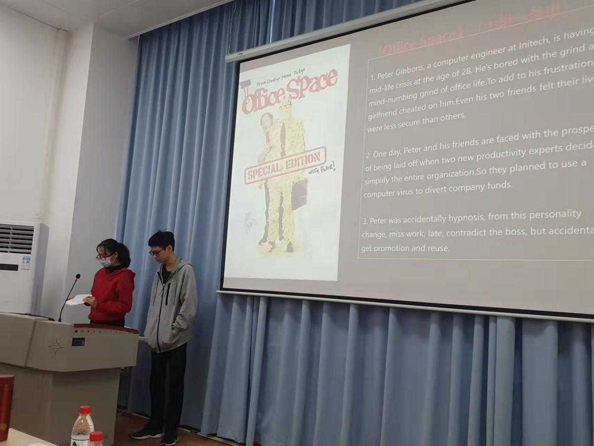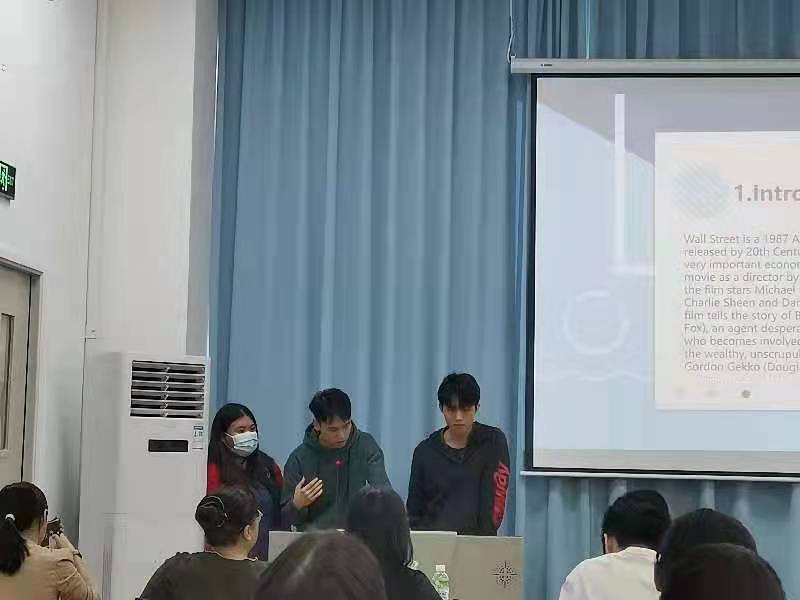 接着是2019级工商管理(国际班)的英文电影观影分享。该活动要求同学们观看一部英文电影,熟悉其剧情、并结合所学的管理类课程展开分析,在提高英语的同时,巩固、加强专业知识。陈述由各小组集体或派代表上台进行。小组代表除了向在场的师生们阐述了电影的主要内容外,还结合自身的见解和课堂知识,分享在影片中学习到的管理类知识。