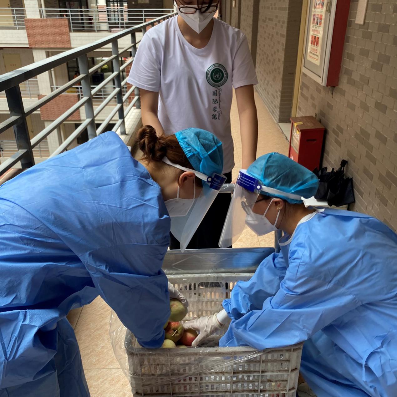 suncitygroup太阳新城的志愿者们正在给宿舍的同学们送餐
