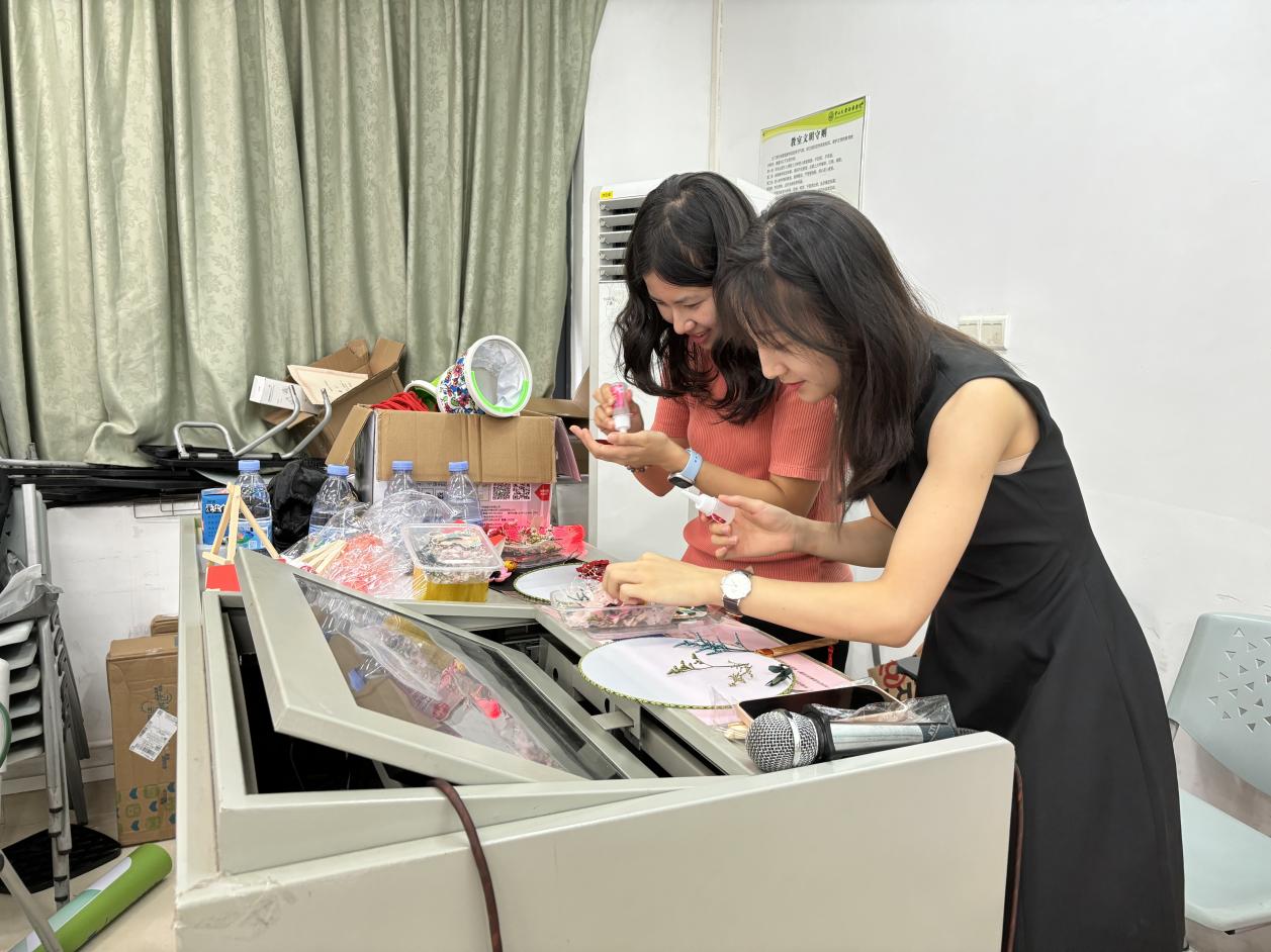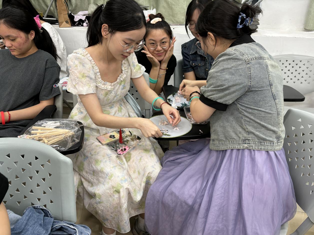 在游戏间隙,学生们还利用团扇与干花等材料,制作出独具匠心的团队团扇。这一环节不仅增添了活动的趣味性,也进一步加深了团队成员之间的友谊和团队归属感。