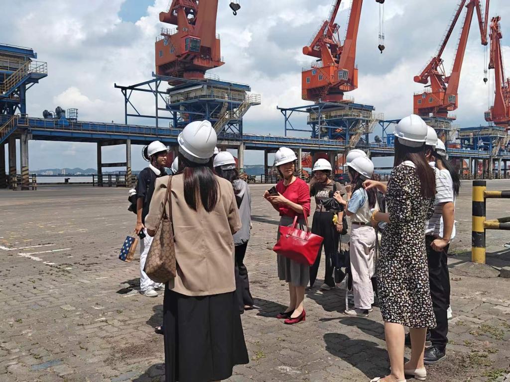 登上公司顶台,俯瞰整个港区,东莞深赤湾港务有限公司的壮丽图景尽收眼底。在此,公司领导不仅详细介绍了公司的发展历程、成就及未来规划,还特别分享了企业在党建引领下的创新发展之路。这一次的分享,不仅让师生们看到了企业党建工作的实际成效,也启发了大家对于如何将党建优势转化为发展优势的深刻思考。