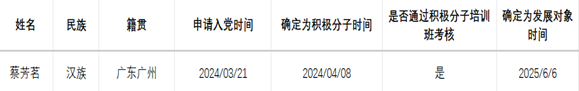 经个人自愿申请,党组织的培养、教育和考察,蔡芳茗同志已基本具备发展对象条件。为发扬民主,广泛听取党内外群众意见,接受广大党员群众监督,现将蔡芳茗同志的情况予以公示,公示期限为5天(2025年6月6日-2025年6月13日)。如有异议,可在公示期内向本支部反映。